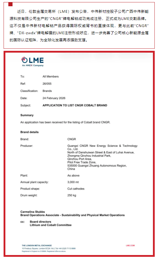 中偉新材“CNGR”牌電解鈷成功注冊為LME交割品牌
